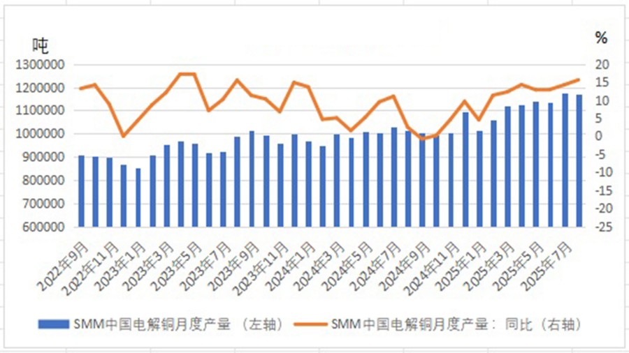 需求方面,据调研,8月,精铜制杆、铜板带开工率环比增长,再生铜杆、铜管等行业开工率环比下降,其调研预期9月电铜杆、铜管、铜板带等行业企业开工率将有回升,废铜杆企业开工率环比将有下降。从终端需求表现来看,目前,铜价持续高位运行对线缆行业采购依然形成部分限制作用,但随着国庆节假期的临近,下游节前备库需求存在一定消费拉动空间。空调方面,相关数据显示,9月,家用空调内销排产572万台,较去年同期内销实绩下降6.3%。去年,在出口需求刺激下空调行业生产提前启动,考虑到今年美国关税不确定性影响带来的部分出口需求前置,9月,空调行业生产回升空间恐较为有限。空调行业难以如去年一般提前启动旺季生产,因此,短期内仍将延续淡季特征。8月12日,财政部会同商务部、中国人民银行、金融监管总局等部门发布《个人消费贷款财政贴息政策实施方案》,自今年9月起一年内,消费者在汽车等领域的消费贷款可享受财政贴息。目前,正值汽车行业产销旺季,汽车行业产销有望继续加速。